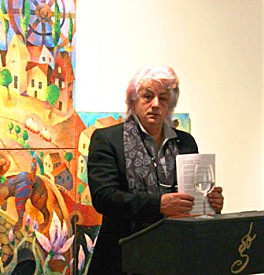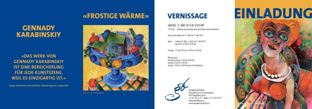 Sehr geehrte Damen und Herren! Liebe Kunstfreunde! Geschätzte Freunde der Galerie! Wir schreiben das Jahr 2014. Das Einladungsbild "Frostige Wärme" es passt bestens ins 2014, tut es immer noch. Das letzte Bild, die letzte Skulptur ist nicht fest zu machen. Viele der Unentwegten machen gute Bilder und gute Skulpturen. Manche Wenige besonders gute Bilder und manche der Wenigen besonders gute Skulpturen. Die Bilder sowie die Skulpturen sind autonom. Wer will kann sich den Bildern von Gennady wie auch den Skulpturen von Manuel aussetzen, einen Moment lang, oder andauernd. Es kann doch nichts passieren. Der Sog, er saugt nicht wirklich in die Tiefe und für mögliche auftretende Erkenntnisse ist jeder selbst verantwortlich. Und die Ewigkeit betreffend, ändert sich überhaupt nichts. Der Stein der Weisen, er ruhe in Frieden. Dem Geheimnis Gold zu machen, lässt sich weder technisch noch theologisch auflauern. Wer will schon heute noch der Alchemisten Schicksal teilen? Abgesehen war "Lauern" noch nie ein taugliches Mittel, die Wahrheit zu erhaschen. Nach diesen von mir gedachten, einführenden Worten will ich Sie, geschätzte Freunde und Kunstinteressierte im Namen der beiden Künstler Gennady Karabinskiy und Manuel Müller recht herzlich willkommen heissen. Kunst kommt von Können, lehrten uns Caravaggio, Michelangelo, Raffael, Picasso und viele andere wahrhaften Künstler. Die Zürcher Kunstszene hat internationale Strahlkraft. Fenchelsalat an sizilianischer Paste und stets der richtige Wein. Die Beziehungsfolge im Kunstmarkt ist harte Arbeit. Kunst kommt vom "Können" ….. nein, behaupte ich, Kunst kommt von "Kennen". Kunst ist Kommunikation. Die Kunstwelt selbst hat ihre Vernetzungen immer wieder zum Thema gemacht. Der amerikanische Künstler "Francis Picabia" etwa entwarf 1919 sein "Dada Movement"; in den 70igern erregte der Grieche George Maciunas mit seinem Fluxus-Diagramm Aufmerksamkeit. Beide Darstellungen zeigen vor allem die Beziehungen der Künstler untereinander, ihre Freundschaften, Liebschaften, familiären Verpflichtungen. Später wurden diese Netzwerkdarstellungen erweitert, es stiessen dazu Galeristen, Kuratoren, Sammler, Museumsdirektoren, Verleger, Mäzene und die ohne dies alles besser wissenden Kritiker der schreibenden Zunft, die sogenannten Experten in jeglicher Beziehung dazu. Der wohl nicht aus Ressentiment entstandene "Schweizer Stammbaum" der Schweizer Kunstmafia von Hans Rudolf Ambauen, selber Künstler, erfolglos, portraitierte eine Kunstwelt, in der nicht die schöpferische Kraft der Künstler über Erfolg oder Nichterfolg entscheidet, sondern eine Marktmaschine. Ich bin mir bewusst, das Genie im Kellerloch hat heute keine Chance mehr. Wer keine Beziehungen hat, existiert nicht. Wer glaubt Kunst sei ein Geheimnis, Kreativität, etwas "Göttliches" wird als naiv angesehen. Wie gesagt: "Kunst ist Kommunikation." Ein Künstler schaut heute, dass er die richtigen Leute kennt – aber wer sind die richtigen Leute – die seine Arbeiten sehen, welche sind die richtigen Leute? Diejenigen, die Geld oder Einfluss oder "Beides" haben. Wie falsch, behaupte ich! Die Stargaleristin Eva Presenhuber sagt, sie wird nie mit einem Künstler zusammen arbeiten, dessen Persönlichkeit sie nicht überzeugt. "Ein guter Künstler hat auch eine gute Persönlichkeit. Und damit meinte sie: Er muss mit Leuten umgehen können. Muss er das denn wirklich? Die Börsen boomten, Hoeness zockte, gewann und verlor 130 Millionen, junge Leute verdienten astronomische Summen, und mit den alten Statussymbolen wie Villen, Armani und Ferrari konnte man sich nicht mehr zeigen. Kunst kam dazu. Wirkliche Kunst? Wenn eine Holzpalette mit einem 8 m langem dreckigen Schlauch umwickelt für eine Viertel Million über den Tisch geht, so hat dies für mich mit Kunst nichts mehr zu tun. Ich lasse mich doch nicht veräppeln. Nach meinen philosophischen Betrachtungen der heutigen Kunstszene nun zu den beiden von mir außerordentlich geschätzten Künstlern Gennady Karabinskiy und Manuel Müller.