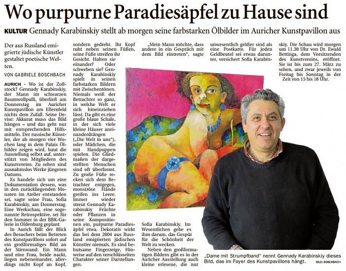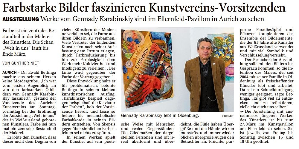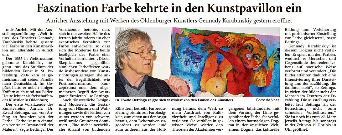 Als ich vor ca. einem 3/4 Jahr zum Hörer griff , um den Wunsch des Kunstvereins umzusetzen, mit Herrn Karabinskiy eine Ausstellung seiner Werke hier im Pavillon zu vereinbaren , war bei mir bereits durch die wenigen mir vorliegenden Abbildungen der Werke eine Faszination entstanden.